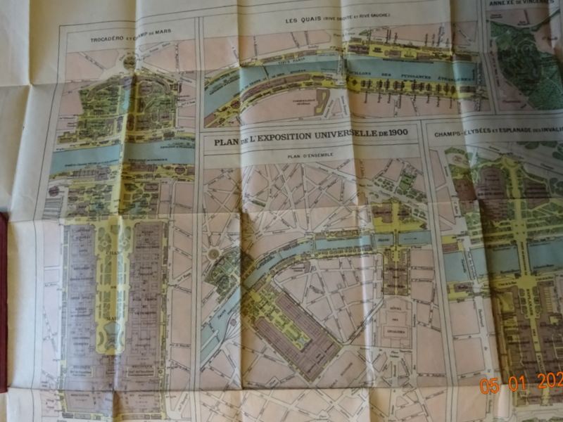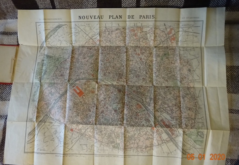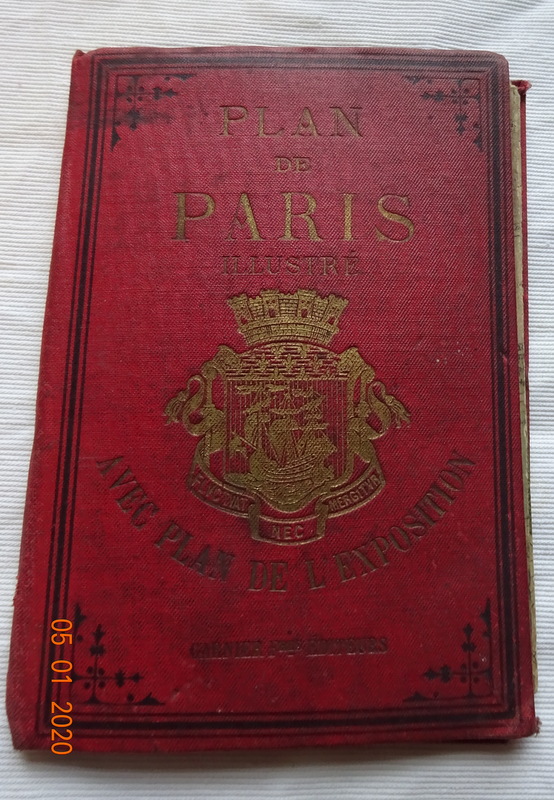 Двусторонний цветной иллюстрированный план Парижа 1900г. На одной стороне план всего Парижа, на другой - план достопримечательностей центра Парижа. Лист, на котором напечатан план, размером 75х55см в сложенном виде вклеен в твердую обложку бордового цвета.